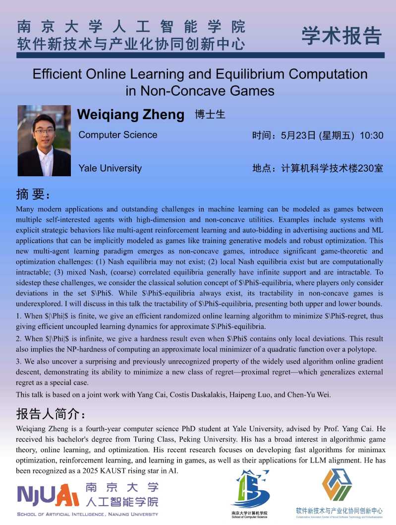 报告题目:Efficient Online Learning and Equilibrium Computation in Non-Concave Games
