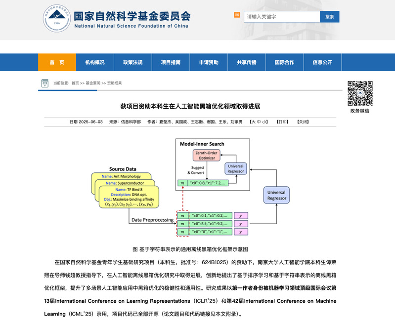 近日,国家自然科学基金委员会官网报道了公司本科生谭荣熙在人工智能黑箱优化领域的研究成果(链接:https://www.nsfc.gov.cn/publish/portal0/tab448/info94976.htm)。