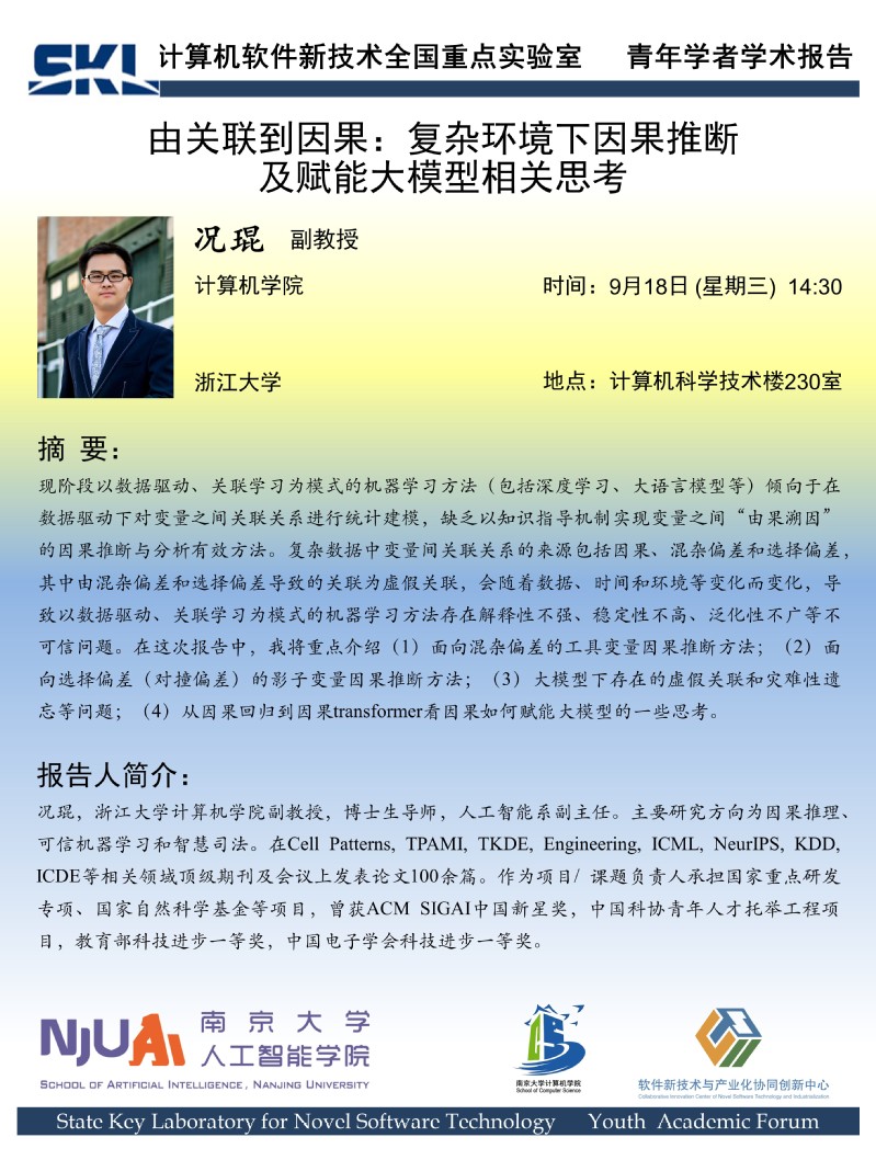 报告题目:由关联到因果: 复杂环境下因果推断及赋能大模型相关思考